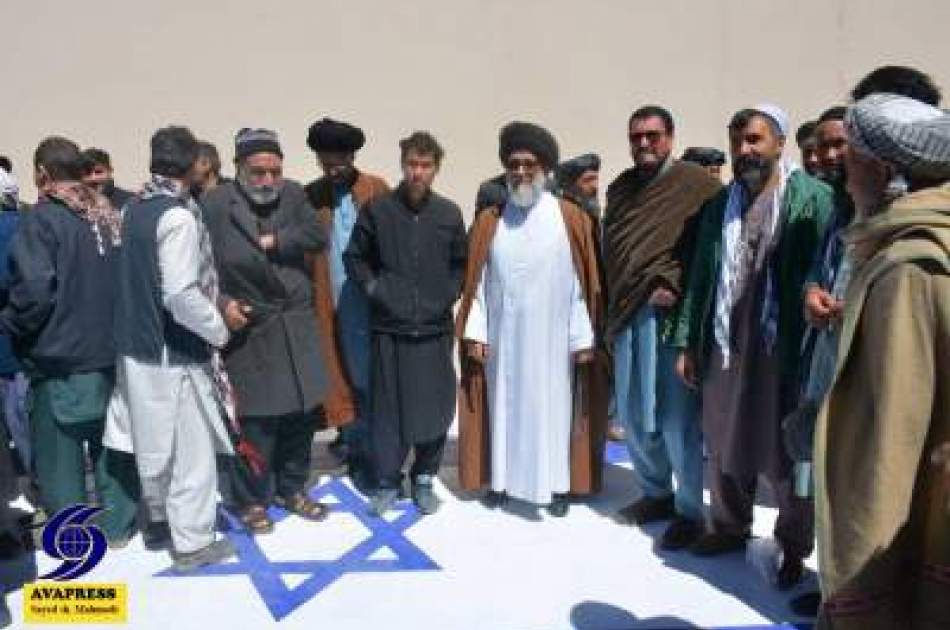 Concurrently with the commemoration of International Quds Day, the Zionist Regime Flag was trampled today (Friday, 28th of March) in the courtyard of the central office of the Tebyan Center in Kabul by cultural figures, political figures, and social figures, including Hojjatoleslam Walmuslim Seyyed Issa Hosseini Mazari, the head of the Tebyan Center for Social and Cultural Activities in Afghanistan, religious scholars, university and seminary professors, and hundreds of people from different walks of life, including women and men, as a sign of protest against the regime's relentless crimes against the oppressed people of Palestine.